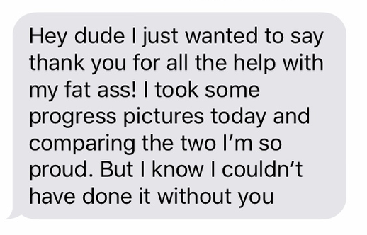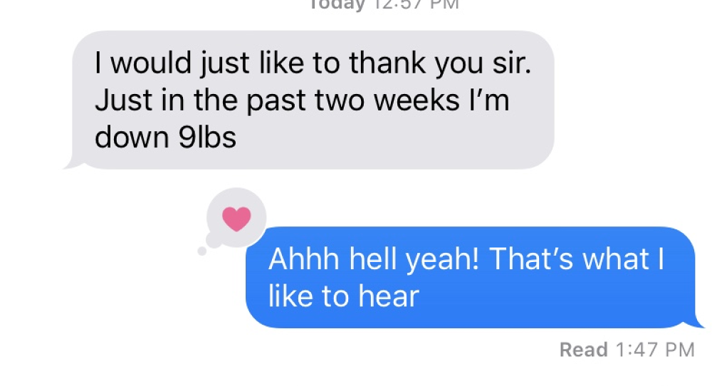 "Micah has been great! definitely recommend the nutrition plan, i’ve been able to eat things I like but still focus on losing the weight. The work out programs are also helpful to stay in a schedule and always have a set work out to do with multiple options. Overall i’ve seen the change I’ve wanted to and now going forward feel more confident in making healthier and better decisions for my body and it’s a lot easier."
